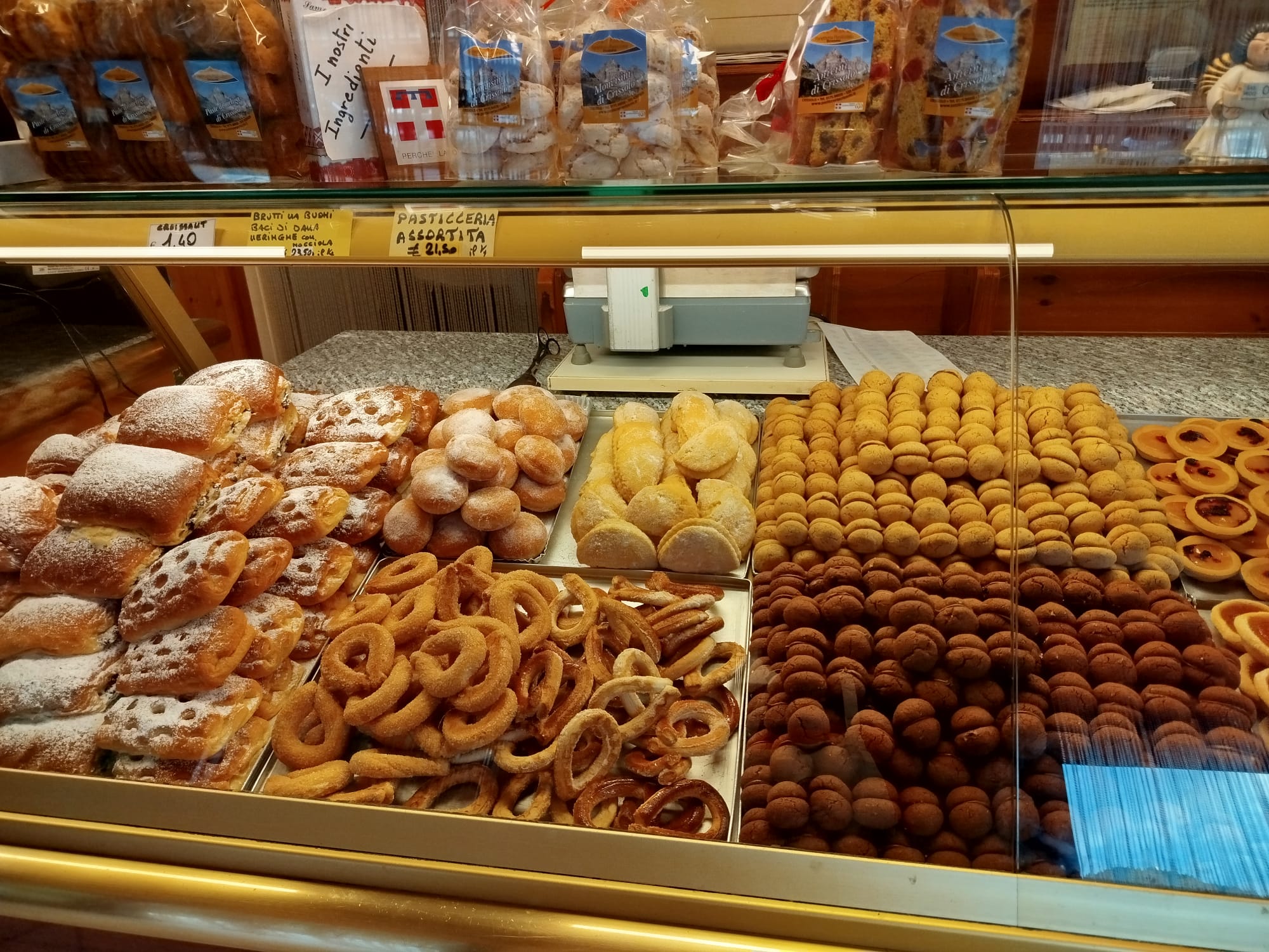 Il negozio, situato sulla piazza principale del paese, oltrea al pane offre specilità artigianali quali le paste di meliga, preparate con un'antica ricetta di metà '900 e prodotte rigorosamente a mano, croccanti alle nocciole, baci di dama al cacao o alle nocciole e molti altri deliziosi dolcetti di pasticceria secca.